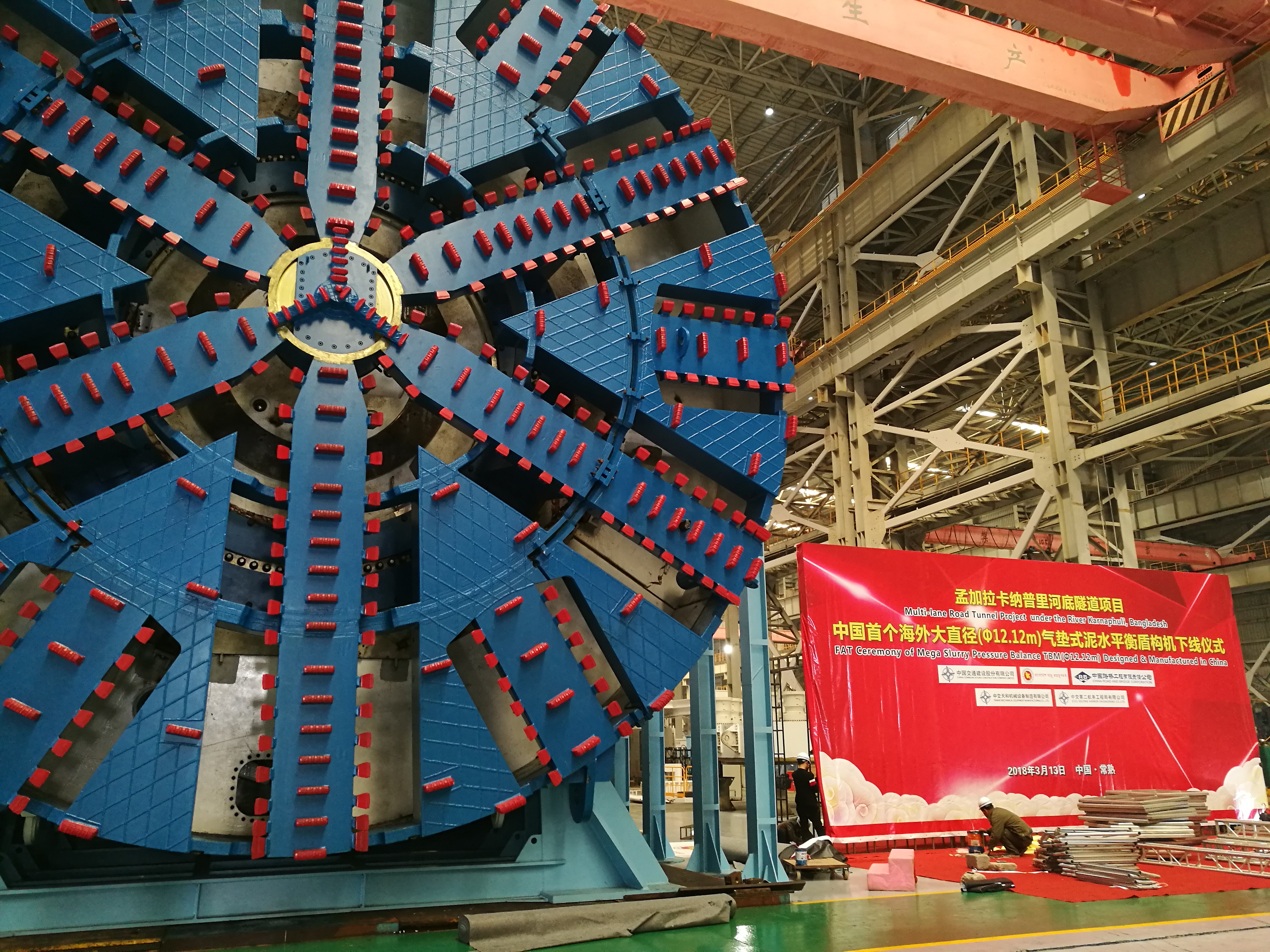 3月13日,由中交天和自主研制的中國出口海外大直徑盾構(gòu)機在江蘇常熟成功下線,盾構(gòu)機刀盤直徑達12.12米、長94米、重2200余噸,是南亞地區(qū)大直徑的盾構(gòu)機。該盾構(gòu)機將用于中國在海外大的盾構(gòu)公路隧道項目--孟加拉卡納普里河底隧道工程,打破了由發(fā)達國家對海外超大直徑盾構(gòu)市場的壟斷,標(biāo)志著中國盾構(gòu)機設(shè)計研發(fā)能力達到了領(lǐng)先水平。